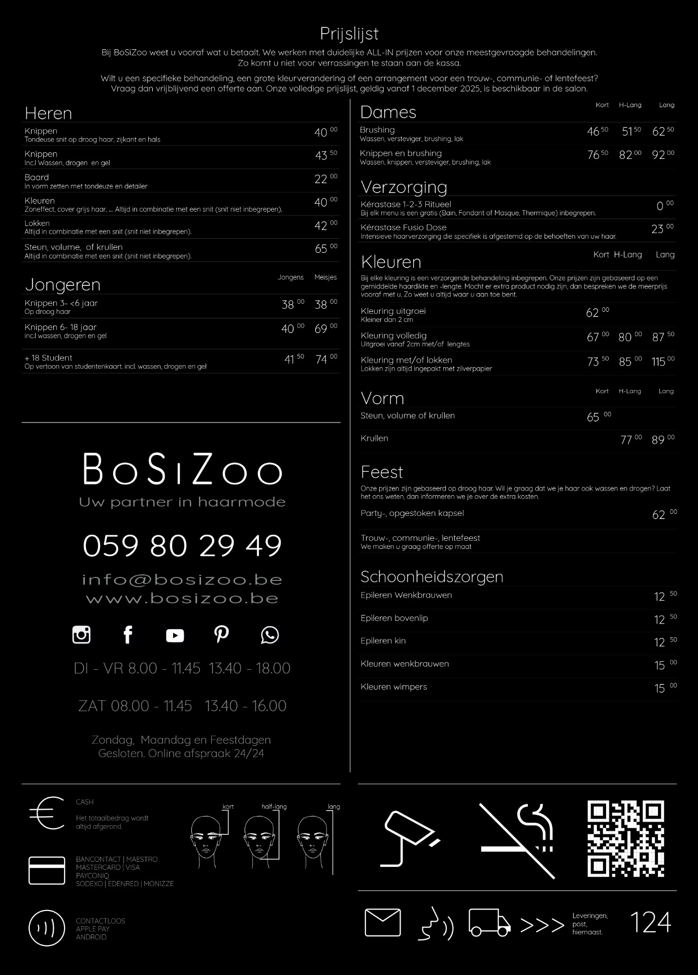 Onze volledige prijslijst, geldig vanaf 1 maart 2025, is beschikbaar in de salon.